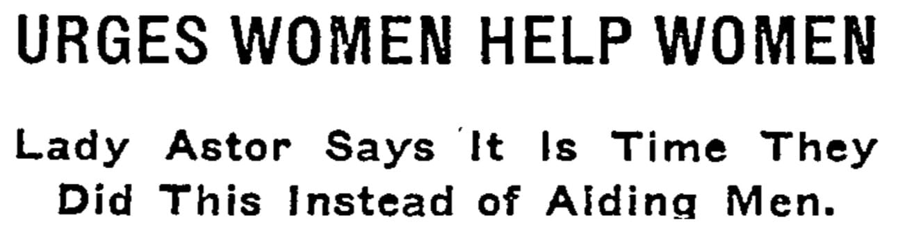 When last we encountered Lady Astor, she was chasing down a burglar in the street. Today this fascinating person (who would one day become an accused Nazi sympathizer), is in the news to make two seperate points we can all surely agree on: women should help women, and Lady Astor’s sister is lazy.