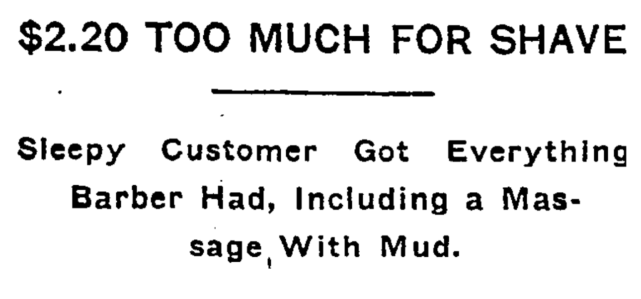 “Although you have apparently reduced your price for shaves from $3.15 to $2.20,” Magistrate Corrigan told Harry Rose, a barber, in Jefferson Market Court yesterday, “I find you guilty of disorderly conduct for putting mud in the face of the complainant and fine you $25, or sentence you to five days in the workhouse.” Rose works in the barber shop of Joseph Bold, Seventh Avenue and Thirty-third Street.