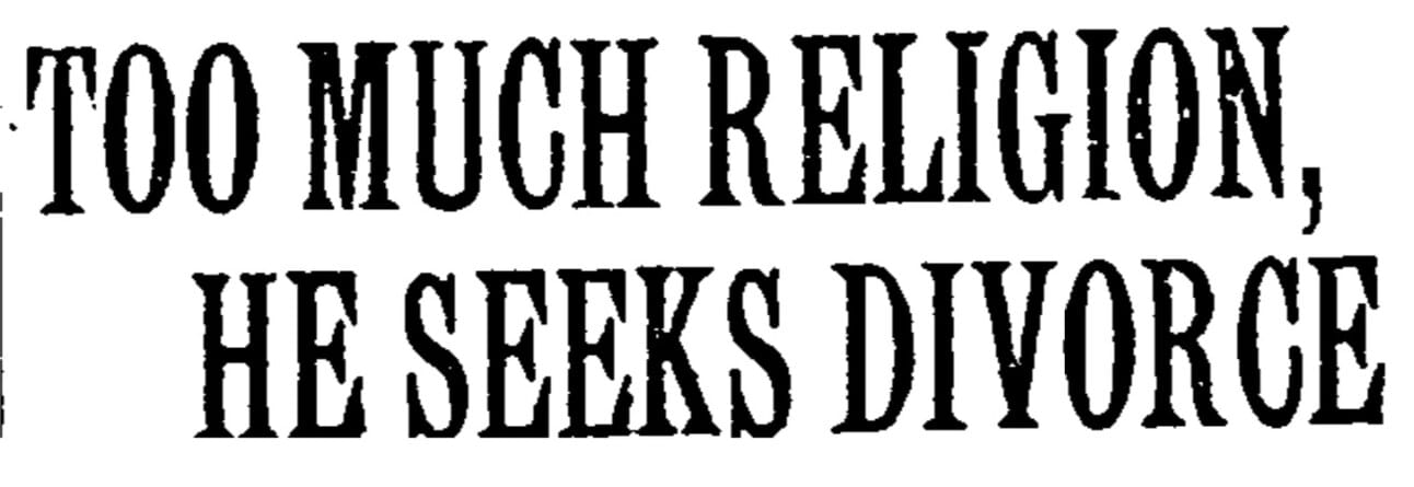 The McDonoughs were Episcopalians when they were married at Manchester, Vt., Nov. 22, 1893, the petition says. Ten years ago his wife “began changing her religion with her clothes and she persistently harassed the petitioner because he refused to change with her.” First she was a Spiritist and then in succession she was a follower of these religious cults: Economites, Mesmerists, Mind Readers and Fortune Tellers, Christian Scientists, Theosophists, New Thought, Angel Dancers, Numerologists.