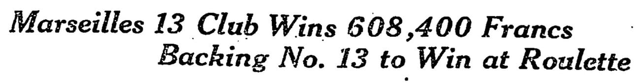 So far no misfortune has befallen any of them, but to try fortune still further on Friday, May 13, of this year, the numerals of which added together give the figure thirteen, they tried a new experiment. They hired an automobile which bore the number thirteen and drove to Monte Carlo. They arrived there at noon and paid a visit to the Casino. At thirteen minutes past thirteen o’clock, (1:13 P.M., according to American reckoning) they all staked 1,300 francs on No. 13 on the roulette board.