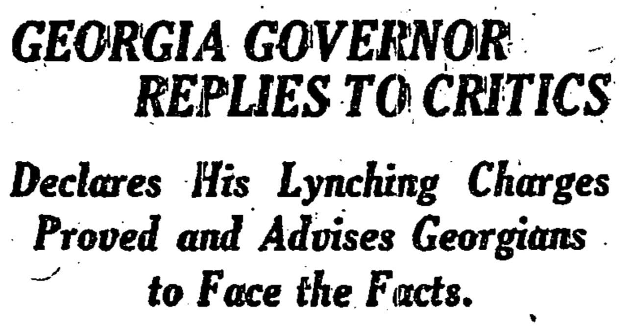 ATLANTA, Ga., May 18.—Governor Hugh Dorsey today made a formal answer to State Senator Samuel Olive, Judge W.E.H. Searcy and others who have criticized his booklet, “The Negro in Georgia,” upholding his pamphlet, declaring his charges proved, and asserting that it was better for Georgians to face conditions as they are and try to remedy them than to satisfy themselves with mere denials.