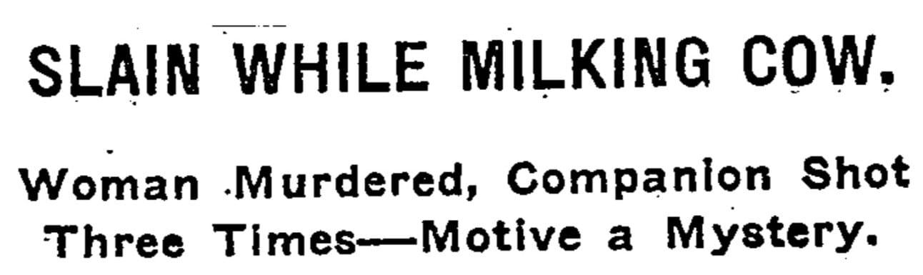 ELIZABETH, N.J., May 22.—Gonofrio Guastella and his cousin, Mrs. Rosario Digrato, were milking cows in the Digrato barn at 544 Fourth Avenue this morning when Andrew Danna of 500 Elizabeth Avenue entered, cried “traitor!” at Guastella and sent three pistol bullets into his back and shoulder. Mrs. Digrato flung herself in front of the weapon and fell dead with a bullet in the heart. Digrato found her body when he returned from delivering milk.