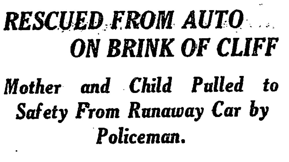 Patrolman Louis Glantzlin of the Richmond Hill Precinct in a thrilling rescue Friday night saved the lives of Mrs. William Andrews and her three-year-old daughter by dragging them from their runaway automobile a moment before it shot over a thirty-foot embankment. The rescue was effected so close to the edge of the cliff that Andrews, who had stopped his car at the top of a hill to light the tail light, failed to see his wife and child dragged from the machine, and, rushing after it down the embankment, pulled frantically at the wreckage, thinking that his family was underneath, until Glatzlin finally succeeded in attracting his attention.