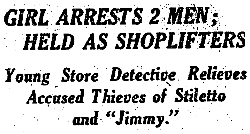 The two men went into a washroom in the rear of the store, with Bankeser close behind. When they saw her enter and approach them she said Corti pulled a stiletto about eighteen inches long from beneath is belt, but Miss Bankeser did not scream or faint, but told both men they were under arrest and took them in custody.