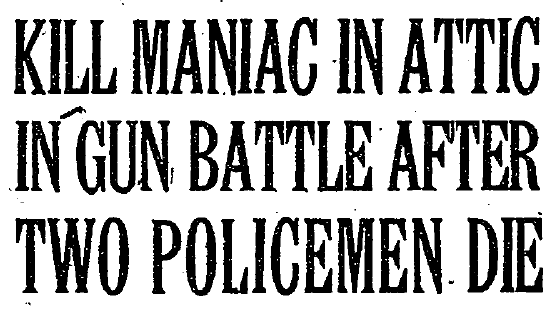 Detectives took to the roof of the house. They kicked off a skylight cover and from their position could see blood running from Mossburger’s body. With the detectives on the roof, Kelley started firing through the windows. Policemen, taking up their stations across the street, behind trees and poles, answered his fire. At this the detectives on the roof had to leave hurriedly, because the bullets from their comrades were coming too near them.