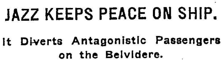 But he found a way. And he seriously said it was jazz music, played frequently and loudly by the ship’s orchestra. The musical classics were put aside and only American popular airs were heard. The result soon showed, according to Captain Ragusin, and yesterday when the Belvidere docked there were no casualties to report. Greeks helped Turks with their baggage and vice versa. Rumanian mothers held Bulgarian babies while their mothers conferred with customs men.