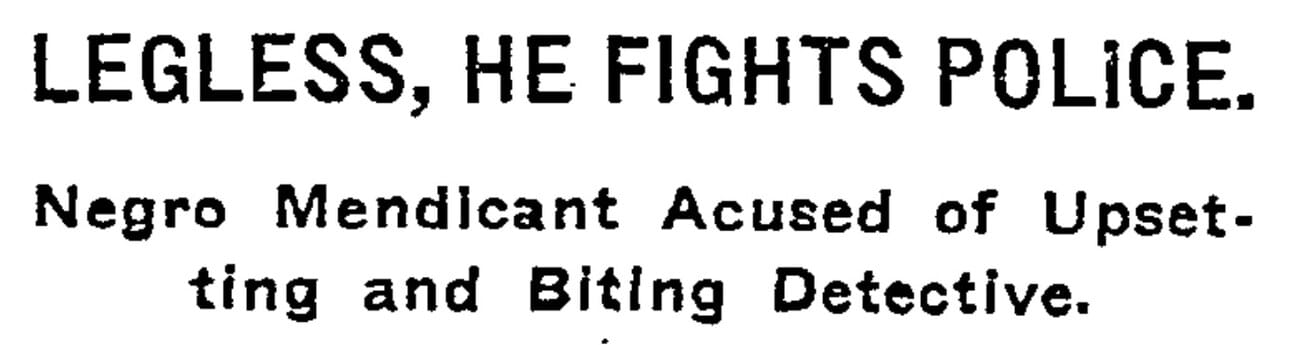 Detectives Plagge and Halstead of the Mendicant Squad arrested Stewart in Forty-second Street for soliciting alms. The negro, they charge, grabbed Plagge about the legs, threw him to the ground and began to bite him. Halstead joined in the fight, while a large crowd gathered and openly sympathized with the negro.