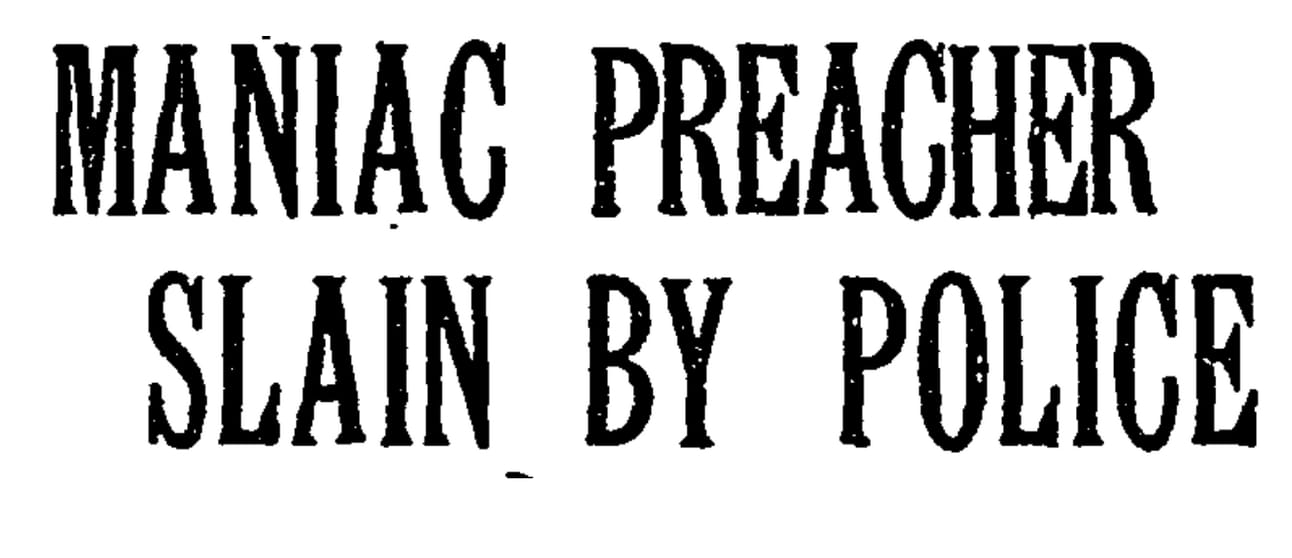 ATLANTIC CITY, N.J., June 24.—“Dr.” D.D. Murphy, negro leader of a religious sect known as the “Live and Never Die,” barricaded on the third floor of a house at 116 Disston Avenue, this afternoon stood at bay for three hours until shot dead by Detective Frank McDowell. One policeman and Elizabeth Chappelle, 117 Disston Avenue, a negress, were wounded by the maniac. A second policeman narrowly escaped injury.