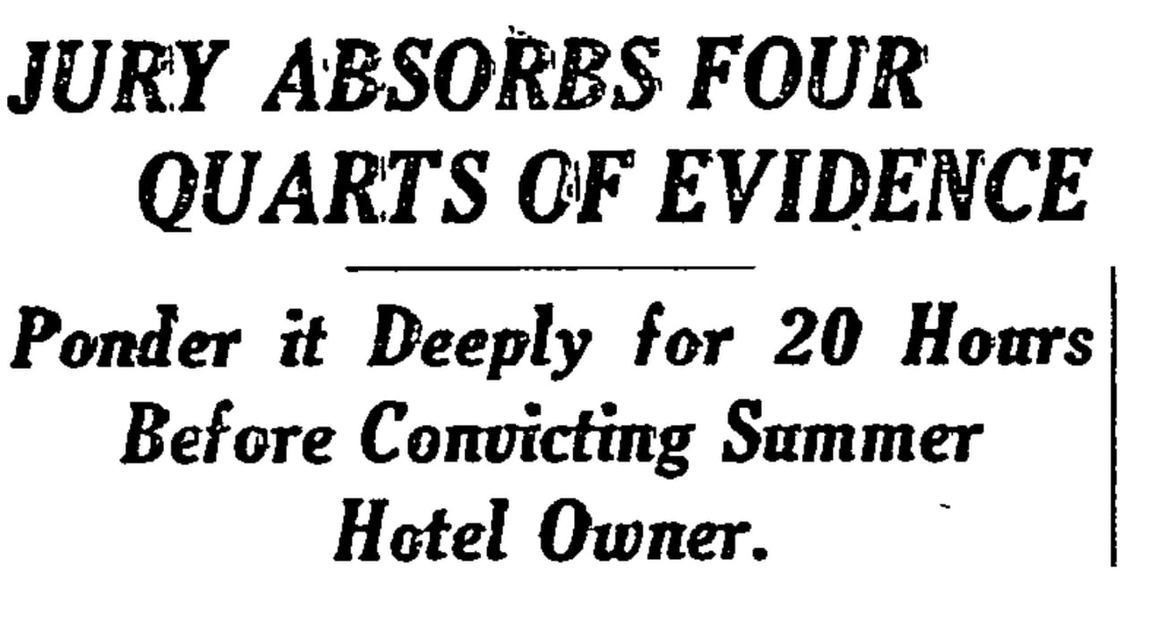 CHICAGO, June 29.—It took a Lake County jury twenty hours to decide that Joseph Hoffman, proprietor of a Summer hotel at Fox Lake, was guilty of violating the prohibition law. At the end of that time they staggered forth, hair disheveled and collars awry, but their eyes a proud gleam which told that they had done their duty as they saw it.