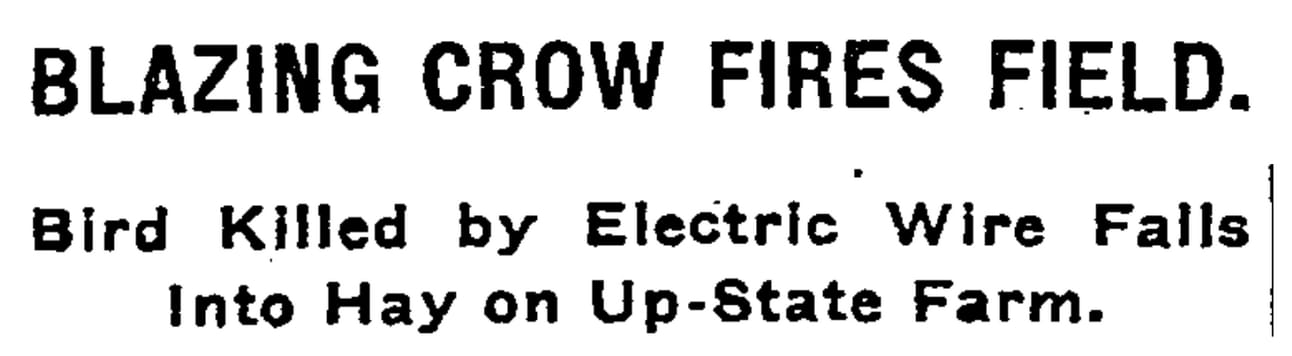 ROCHESTER, N.Y., July 8.—A crow alighted on a heavily charged electric wire of the Niagara Power Company yesterday and was instantly electrocuted, falling a blazing mass into a field of uncut hay belonging to Hobart Stahl, near Spencerport, eight miles from here.
