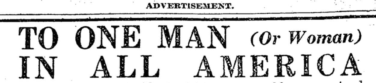 Another bizarre ad! The hyperbole here is incredible. Like Brown’s Job, it is so inflated that by the time you get halfway through you’re convinced that this incoherent text is the most important ever composed by human hand. What could this anonymous A.M.S. have been pitching? A new religion? A political movement? Vacuum cleaners? Probably it was vacuum cleaners.