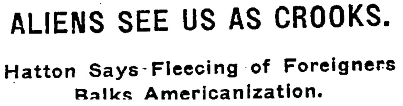 The petty grafting of lawyers, real estate dealers, steamship agents and others who take advantage of the foreigner in America was pictured as the greatest foe to Americanization because it gave foreigners an inaccurate idea of what America represents.