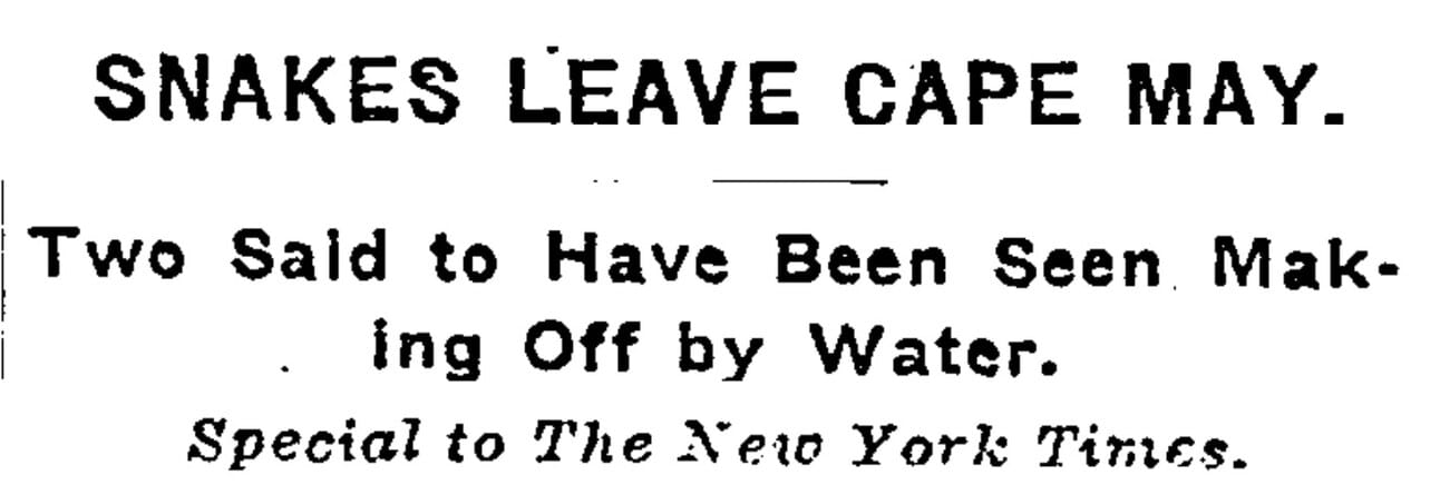 Turner, who is one of Cape May’s respected negro fishermen, was telling an employee of the Bethlehem Steel Company about it at the proving grounds on the Delaware Bay shore, when a black snake crawled to the water’s edge and struck out for the Delaware shore, some eighteen miles away at this point.
