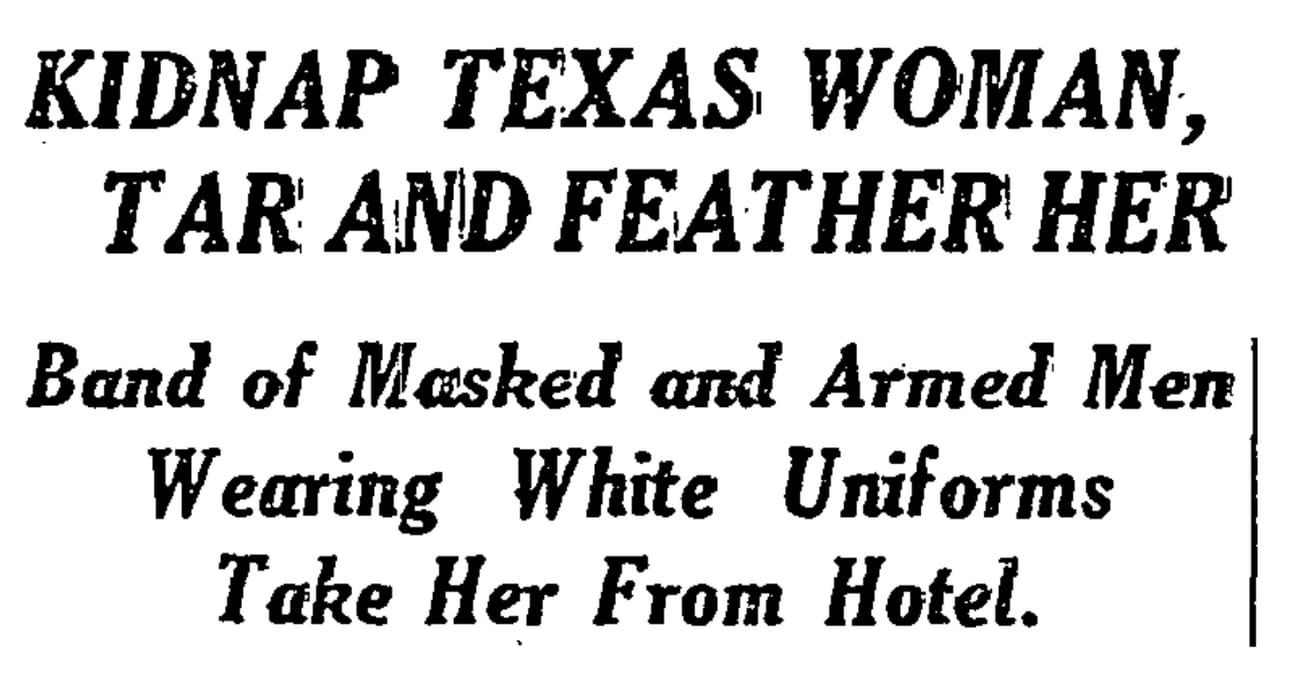 The attack on Mrs. Johnson, which occurred last night, was said to have been made by masked men wearing white uniforms. They are said to have driven up to the hotel in three automobiles and filed out, displaying firearms, and to have taken the young woman into one of the cars.