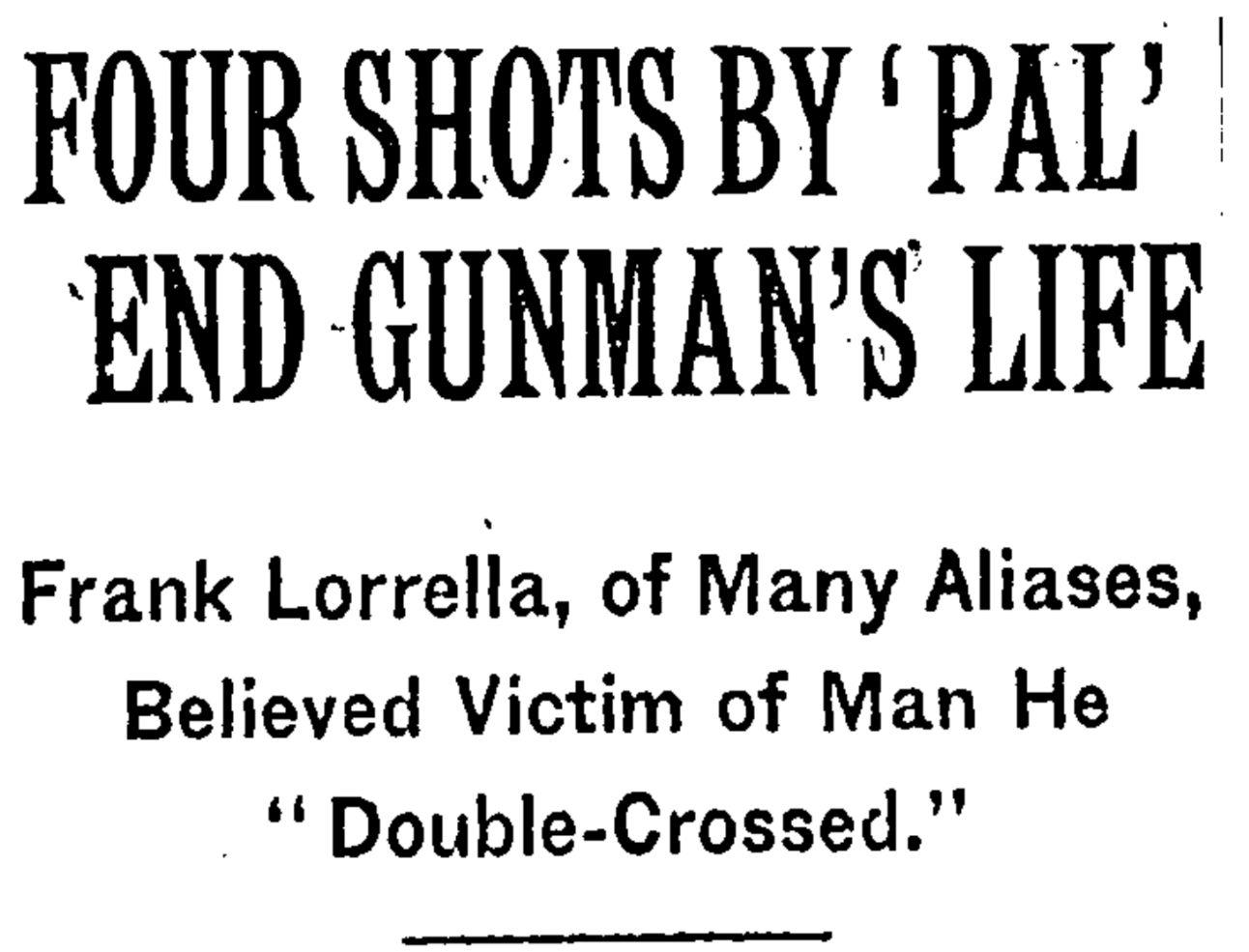 Frank Lorella, of many aliases, ten times in the hands of the police in his 29 years of life, will never “pull off” another burglary. Last night as darkness fell in the shadows of Chrystie Street, a “pal” emerged from the underworld, carrying a grievance and a gun. Four bullets from the latter found Lorrella, the last piercing his heart. And the shooter slipped back into the security of his haunts.