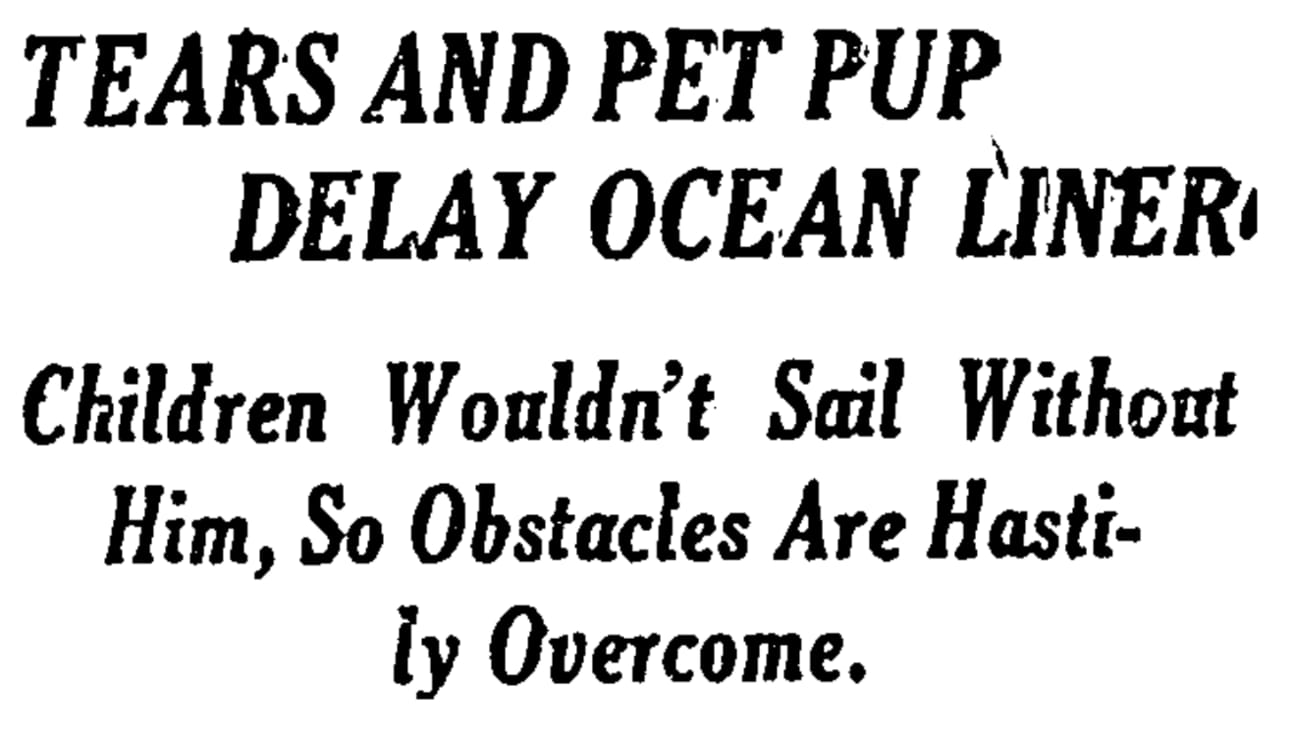 The pup was duly crated, the children all smiles and the dog happy, when a new obstacle arose. The ship’s officers announced that the animal could not be brought aboard without a health permit issued by the Italian Consul. Again gloom and again tears from the children. But the resourceful Mr. Bachman canvassed the pier and a neighboring wharf, where another steamer was sailing, and located the necessary official.