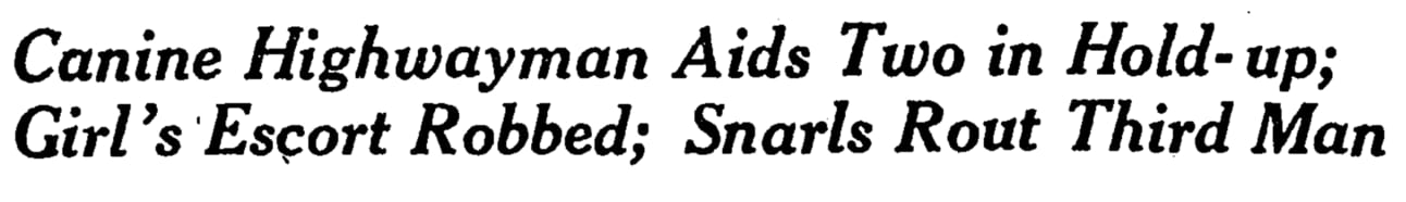 The two robbers glanced admiringly at their dog and then significantly at each other, according to Feis, as if to congratulate themselves on the thoroughness of the dog’s tutoring. Then they proceeded with the robbery, taking $43 and a gold watch from Feis.