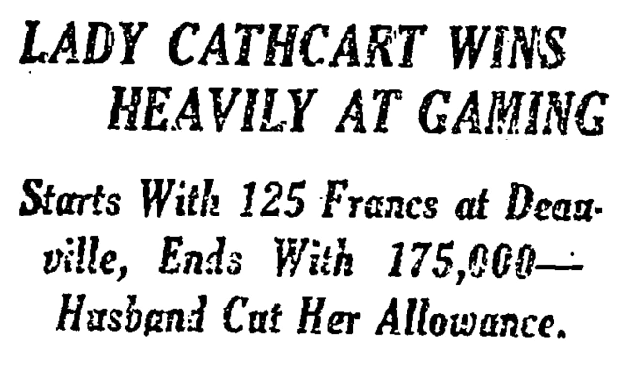 LONDON, Aug. 8.—London society is interested in a report that the Countess of Cathcart won a large amount of money in two hours at the Casino at Deauville Saturday night. It is stated that she started with only 125 francs, had a wonderful run of luck and rose at midnight the winner of 175,000 francs.