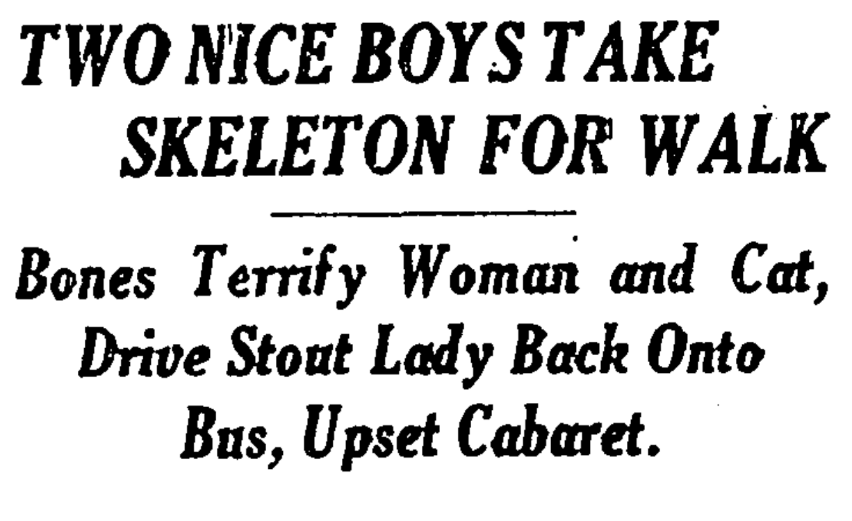 Then Berry and another nice boy made a chair of their hands and carried the skeleton away down the street to Broadway, where they arrived just as a stout woman was getting off a bus. The vehicle was just moving when she espied the spook and, taking three long steps, she emitted a yell and leaped on the footboard again, knocking the conductor inside the bus. The skeleton’s next call was at a cabaret on the corner of Sixty-ninth Street and Broadway, where the boys bobbed it up and down outside the window like a jumping jack to cheer up the dinner guests.