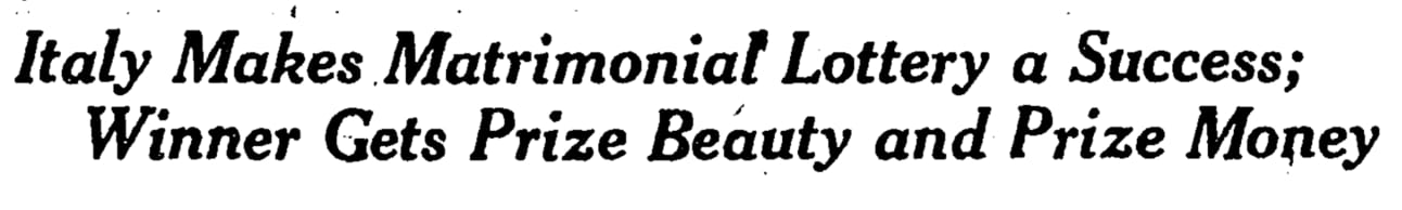 The method adopted is exceedingly simple. First a beauty contest is organized. The winners thereof are then put up for lottery, each ticket costing the small sum of 10 lire. The proceeds are used to constitute a prize for the lucky young women. The male winners of the pretty prizes get the choice of marrying the girl they have won or of dividing the money with her. Presumably the latter also has a voice in the matter.