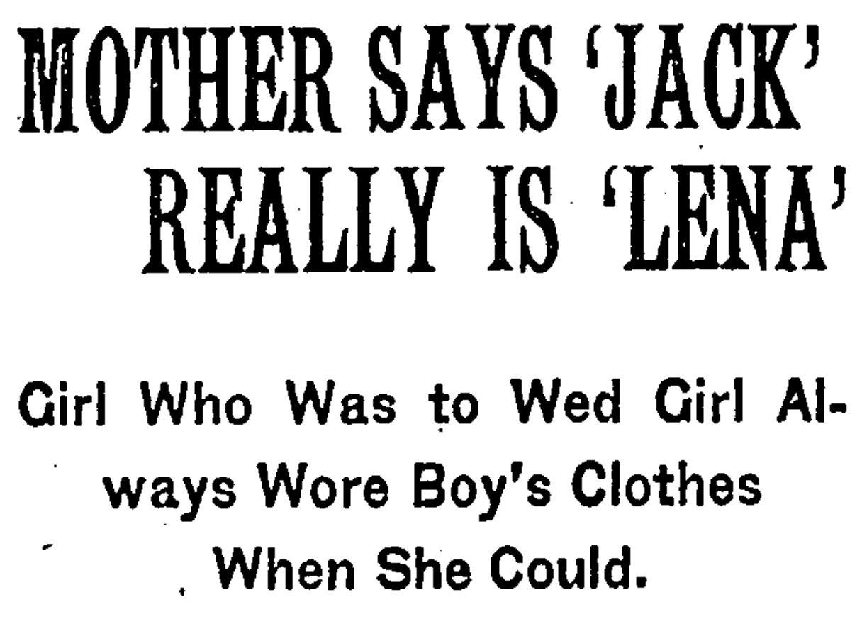 An automobile brought Mary, the waitress, to Sawkill one day in March. She was looking for her lover, “Jack Brown,” and said that she had spent $400, saved for their home when married, in searching for him. She went from house to house until she found “Jack” in female attire and was told that “Jack” really was a girl. Seemingly unable to comprehend the situation, she insisted on marriage to “Jack” and argued earnestly with her parents, said Mrs. Schimeck. Mary remained over night, and next day returned to New York.