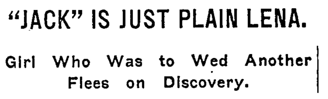 MONTICELLO, N.Y., Aug. 11.—No doubt remained today that “Jack Brown” really was Lena Schimeck. Last night Thomas Walsh, an officer, and the proprietor of the boarding house where Lena had worked as “Jack,” became convinced of the misrepresentation after an interview with her. This morning only the trousers that she had worn, a shirt and other male attire greeted the officer who went to arrest her. All day officers have scoured the country for Mary Holdowanetz, her “fiancée,” in the hope of finding Lena.
