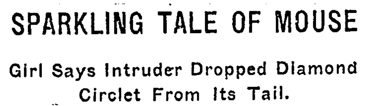 A tale that will interest Curator Ditmars of the Bronx Zoo was narrated yesterday by Miss Genevieve Allen, head of the Abandonment Bureau at the District Attorney’s office. She told of having battled in her office with a mouse that had “a diamond in its tail.” Miss Allen was alone when the “monster” was seen, but she did not faint; instead, she hurled a telephone book at the intruder. Great was her relief when the mouse fled, but greater her joy at finding that the impish little thing had “discarded” a diamond it must have “worn,” she said.