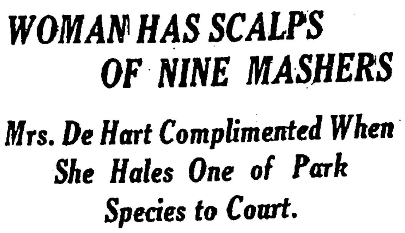 That Mrs. Eleanor De Hart, independent in means and otherwise, and living at 949 Amsterdam Avenue, is the deadly foe of mashers, was the opinion expressed by magistrate Silberman in Night Court last night when Mrs. Hart was complainant against Joseph Zanarelli of 415 West Thirty-first Street, who said he was a foreman in a branch Post Office.