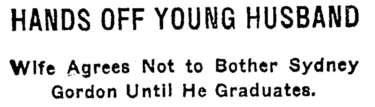 Mrs. Sydney Gordon, 20 years old, of 23 East Seventeenth Street, Brooklyn, filed her consent yesterday in the Supreme Court not to disturb her youthful husband, Robert Gordon Jr., until he finishes college in 1923. As an inducement the young man’s father promised the Court to pay her $1,500 immediately and to give her $25 a week for the next two years, or until young Gordon graduates. Of the $1,500 Mrs. Gordon’s attorney, F. Wright Moxley, will receive half as a fee.