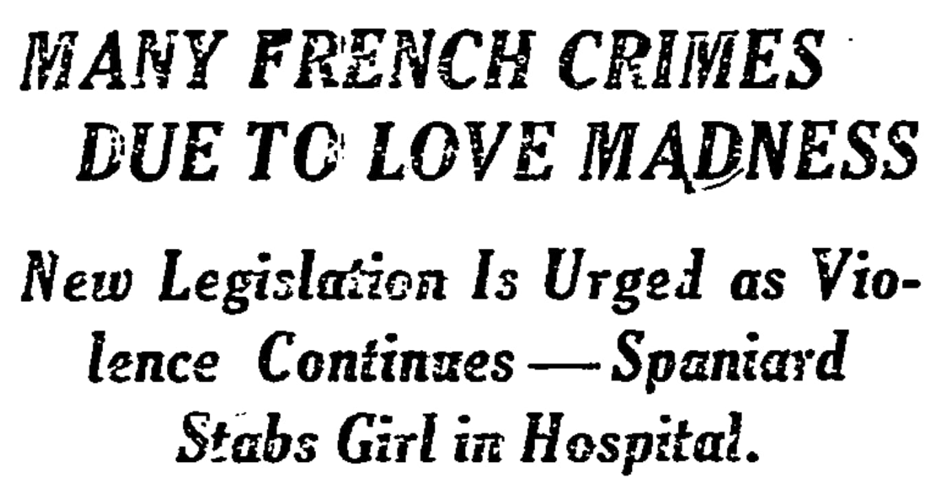 Yesterday a young Spaniard, aged 18, who loved a pretty French stenographer but who had been refused permission to marry her by the girl’s father, visited the hospital where she was ill. Admittance was refused, whereupon the Spaniard broke into the ward and stabbed the girl twice in the neck before the attendants could intervene. She is expected to recover.