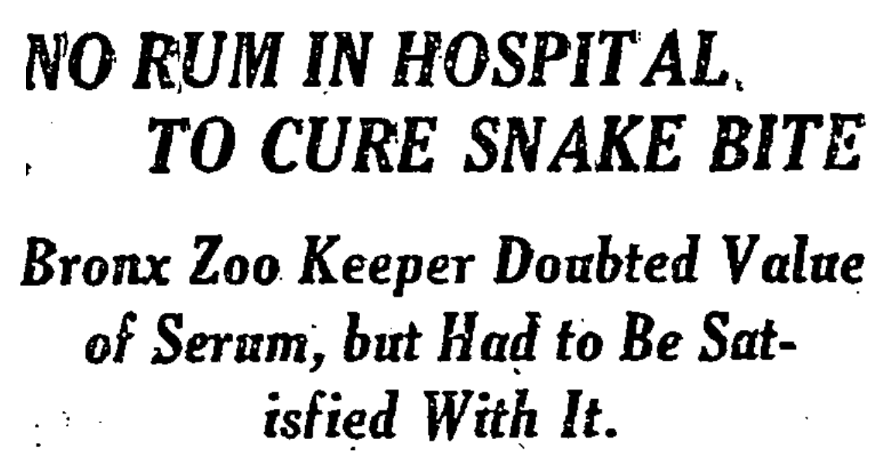 The copperhead is one of the most deadly snakes, and its poison fatal in a short time without immediate and skillful attention. Dr. W. Reid Blair was called and put antiseptic on the wound, then took McArdle to Fordham Hospital. Dr. Blair took with him a serum for snake bite made in South America, the Zoo being the only place in this country where it is kept. McArdle didn’t think much of the serum or other newfangled remedies, and asked for a big drink of whisky. He was told that unfortunately there was none in the hospital and that he would have to take the serum. McArdle, who is 52 years old, and lives at 2080 Walton Avenue, the Bronx, was reported apparently out of danger last night. The bite was the first accident of the kind in the Zoo in six years.