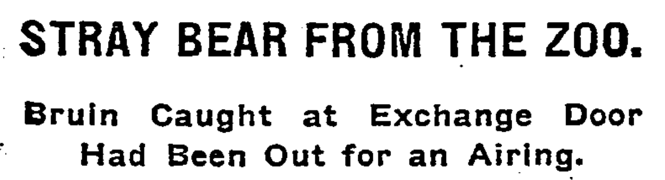 The mystery as to the owner of the bear which tried to gain admission to the New York Stock Exchange on Tuesday was cleared by the appearance of the bear with its owner in the offices of the New York Times last night. The owner is Robert Vincent, who, with George Schleich and James Headgraft, all of Port Washington, L.I., captured him in the Maine woods several months ago. They gave the bear to Mayor Hylan a few weeks ago, who found him to be destructive and proposed that he be sent to the Zoo in Prospect Park. This was done, with the understanding that the captor could take him out for an airing any time he wished. This was granted, and the bear has left the zoo on several occasions.