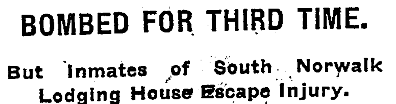 SOUTH NORWALK, Conn., Aug. 24.—A bomb was exploded early today in front of a lodging house in Wood Street kept by Luigi Apicella. The front part of the three-story structure was badly torn, but refused to settle the balance, and no person was hurt. A month ago a bomb of less force did no damage, but an explosion several months ago wrecked the back stoop.