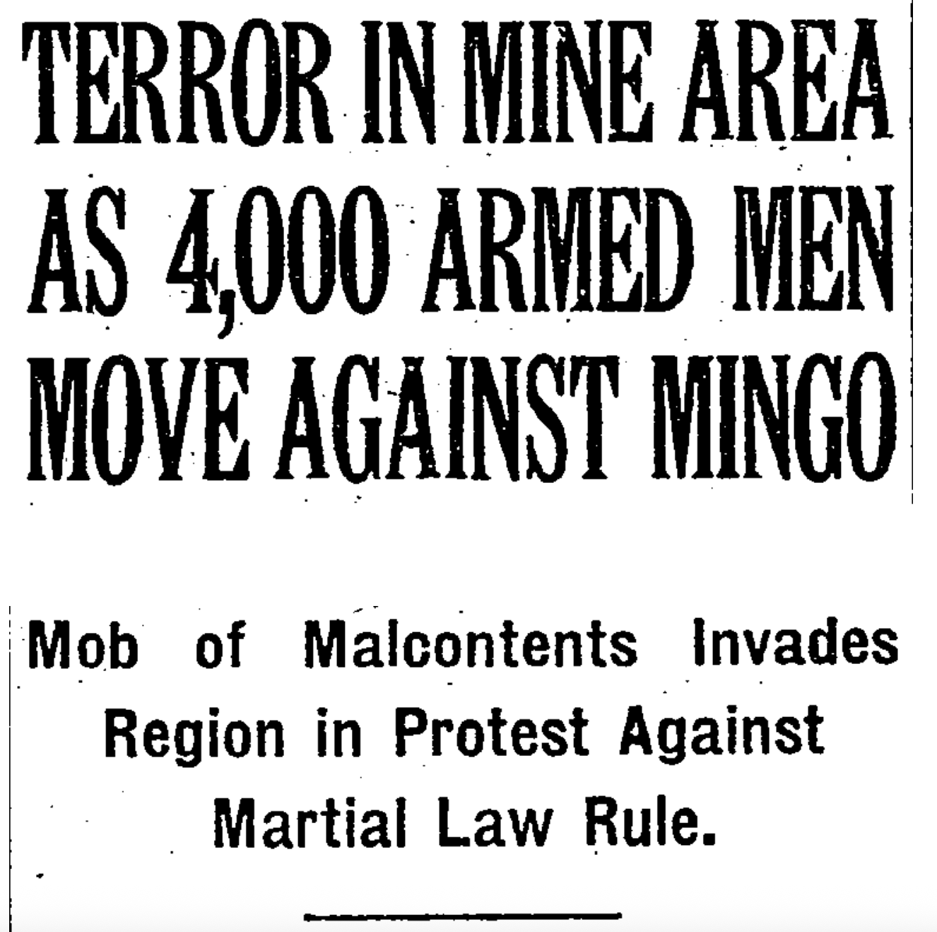 “We are in possession of information that a large body of armed men, numbering several thousands, who have been encamped for several days on Lens Creek, near Marmet, marched early today to near Racine in Boone County, intending the same as a preliminary movement to a march into Logan and Mingo Counties.