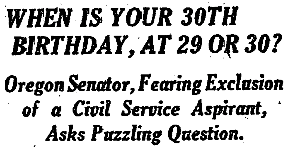 Examinations of candidates for appointment are to be held Sept. 6, and Connie J. Grabb will not be 30 years old until Sept. 17. Senator Stanfield insists that if Grabb could have more than one birthday he had his thirtieth last September, when he was 29 years old. And this is how he figures it: Admittedly everyone’s first birthday is the day of birth, and consequently when one year old the day celebrated, if it may be designated a “birthday,” must have been the second.
